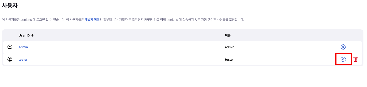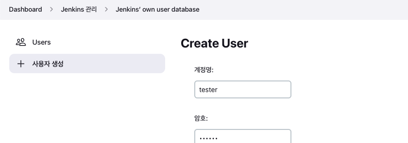 - Jenkins 관리 -> Manage Users -> 사용자 생성