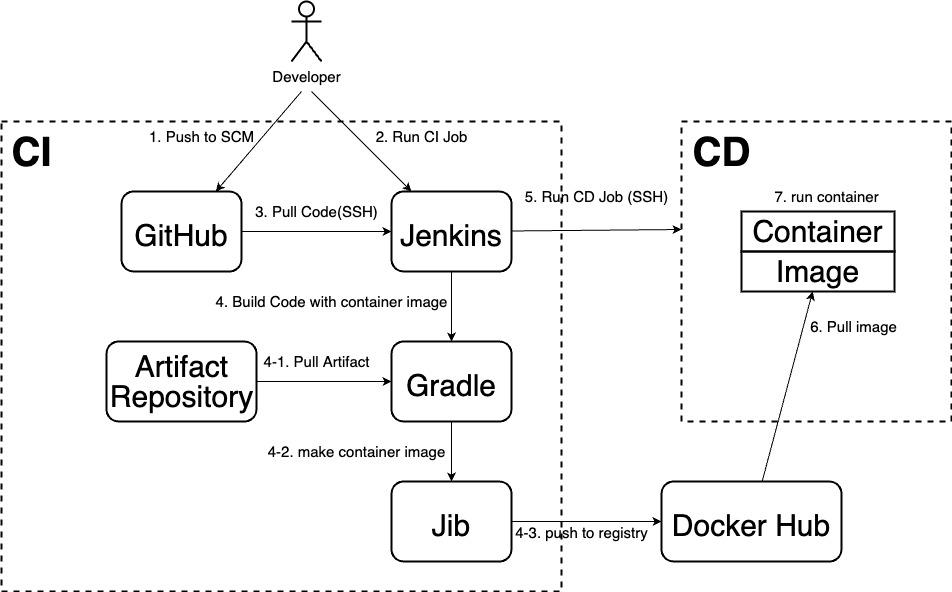 이번 포스팅에서는 Jenkins를 기반으로 CI(Continuous Integration)를 구축했던 과정을 다룬다. Jenkins에서 제공하는 플러그인들과 기능들을 활용하여 빌드 파이프라인 구성뿐만 아니라, 빌드 자동화, 테스트 자동화, 코드 품질 자동화 등의 작업을 파이프라인 상에 같이 연동시켜 사용하는 경우가 많다. 이번 포스팅에서는 Jenkins를 설치하고 간단한 빌드 파이프라인을 구축하는 과정만 다룰 것이고 아래와 같은 순서로 구성된다.