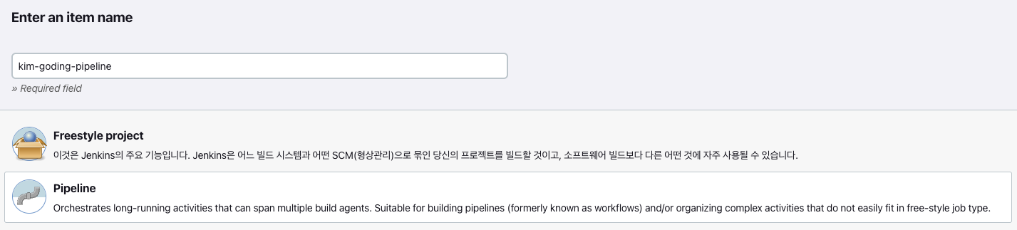 파이프라인 Job 실행을 진행할 서버를 지정하는 부분이다. 예를 들어 jenkins가 master-slave구조로 되어 있다면 Slave에서도 Job이 돌아갈 수도 있고 master에도 Job이 돌 수 있다. 현재 Jenkins가 master-slave 구조가 아니고 Jenkins서버 자체를 사용할 것이기 때문에 any로 하면 해당 Jenkins가 위치한 서버에서 Job이 수행된다.