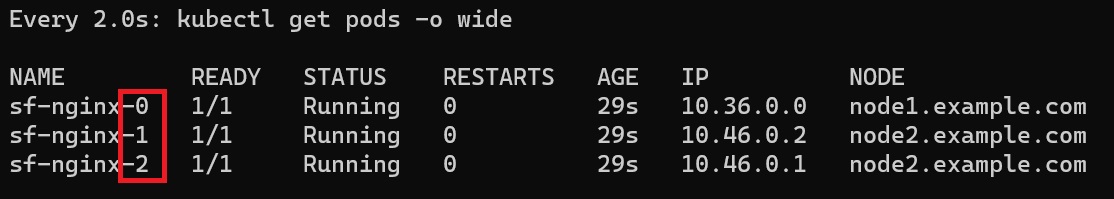 StatefulSet 타입으로 Pod를 3개 실행해달라는 요청을 보내면 Pod의 이름은 순서대로 0번부터 시작하여 순차적으로 증가한다. scale-out 시에는 Pod 순서가 순차적으로 증가하고, scale-in을 하면 숫자가 가장 큰 Pod를 먼저 삭제하는 방식으로 동작한다.