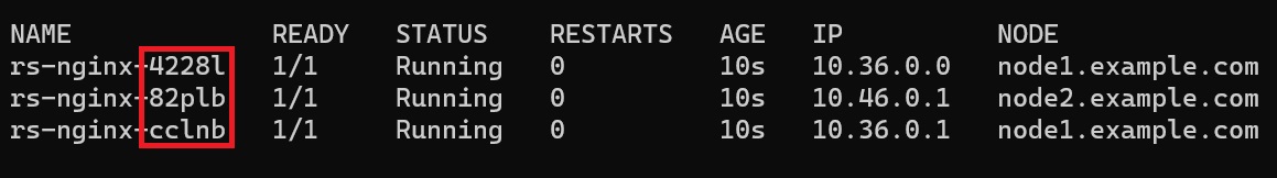 Pod를 생성할 때 NAME 뒤에 추가되는 5자리의 문자는 랜덤으로 생성된 Hash 값이다. 컨트롤러에 의해 만들어진 모든 Pod는 이와 같이 랜덤 해시 값이 붙은 형태로 Pod 이름이 형성된다. 특정 Pod를 지우고 다시 실행되는 Pod의 이름을 보면 이전과 달라진 해시값을 가진다. 즉, Pod의 이름이 보장되지 않는다는 것을 의미한다.