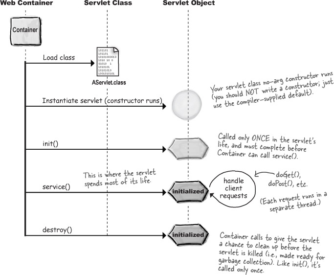주의할 것은 init()과 destroy()는 한 번씩만 호출된다는 것이다. 즉, 매번의 요청마다 서블릿 객체가 생성되는 것은 아니다. WAS 컨테이너가 띄워지고 WAS 컨테이너가 서블릿의 init()을 한 번만 호출하며 그 후에는 요청 당 쓰레드가 service() 메소드를 호출하는 구조이다. 서블릿 객체는 쓰레드 간 공유되지만 service()는 쓰레드 별로 개별 스택 영역에서 관리된다.