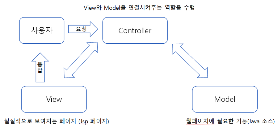 이렇듯 서블릿을 이용해 model, view, controller를 나눠 각각의 역할분담을 명확하게 분리한 구조를 servlet MVC 구조라고 한다. 컨트롤러 영역에서는 서블릿을 포함시켜 WAS 컨테이너에서 서블릿 객체를 호출하고 서블릿 객체가 요청에 맞는 컨틀롤러 메소드를 호출시킨다. 모델 영역에서는 웹 개발자가 구현한 데이터 가공을 위한 로직 코드가 포함되며 뷰 영역에서는 JSP 파일, 또는 HTML 파일 등이 포함되며 만들어진 HTML 파일 등이 클라이언트로 응답되는 구조이다.