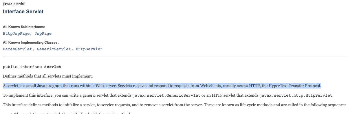 서블릿은 “자바 인터페이스”로 존재하고 있고 위 자바독을 확인해 보면 웹 서버 안에서 동작하는 자바 프로그램이다. 서블릿은 CLIENT로부터 HTTP요청을 받고 이에 대한 응답을 처리한다. 서블릿은 인터페이스로써 스펙(명세사항, specification)일 뿐이다. 서블릿 인터페이스의 구현체로 HttpServlet이 있는데 이를 우리가 직접 확장해서 로직을 작성하게 된다. 이렇게 확장해 구현한 서블릿이 동작하기 위해서는 WAS컨테이너가 필요하다. WAS는 다양한 벤더사가 만들고, 이러한 다양한 벤더사가 지켜야할 규약, 규칙이 서블릿이다.