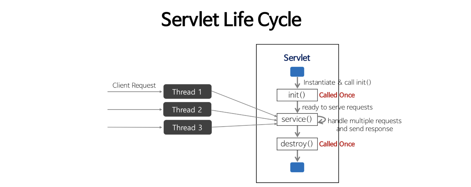 서블릿은 위 그림과 같이 크게 3개의 생명 주기를 갖는다. 첫 번째로 init은 WAS 컨테이너가 처음 띄워질 때 서블릿 객체를 initialize하기 위한 것이고, 서블릿 객체가 initialized되면 이후 클라이언트로 부터 요청을 WAS 컨테이너가 서비스 객체에게 service() 메소드를 호출함으로써 처리한다. 이때, WAS 컨테이너는 쓰레드 풀에서 요청 당 쓰레드를 할당해 서블릿의 service()를 호출한다.