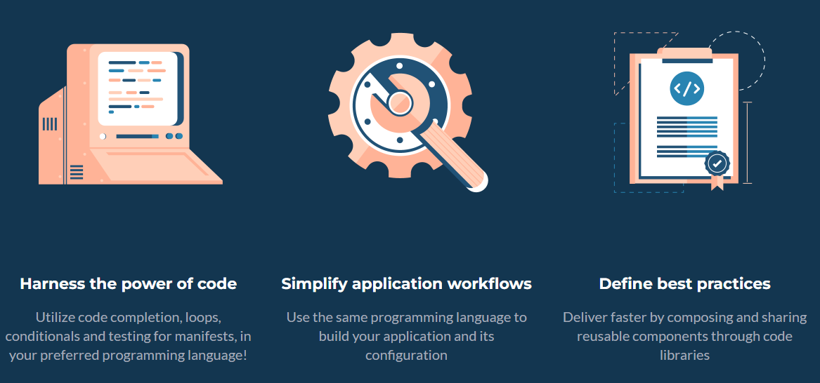 - Go, Java, Python, Typescript 등의 개발자가 익숙한 프로그래밍 언어로 k8s 애플리케이션 정의 가능