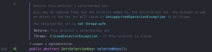 3) selectedKeys(): Non-Blocking I/O가 준비된 Channel들의 Key집합을 반환한다. 결국 Non-Blocking I/O를 할 때에는 selectedKeys메소드를 통해 I/O 준비가 완료된 Channel들을 알 수 있게 되는 것이다. I/O가 준비된 Channel을 selected-key Set을 순회하며 I/O 연산을 진행한다. 반환되는 Set은 Thread-Safe하지 않다고 한다. 따라서 하나의 쓰레드(Poller)에서만 해당 Set에 접근해야 한다.