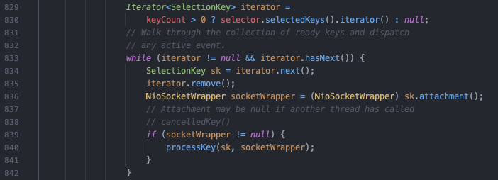 - 위에서 selectNow(), select()를 통해 key 개수를 획득했고 이때 keyCount가 0보다 크다면 실제로 소켓 Channel을 가져오는 연산을 진행한다. (line 830)